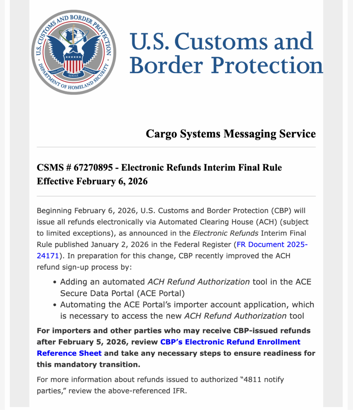 Please review the message below from US Customs regarding instructions on signing up for ACE PORTAL account and setting up the ACH Refund Authorization. In the event of any potential refunds from US Customs, you must have this setup in order to receive refunds."