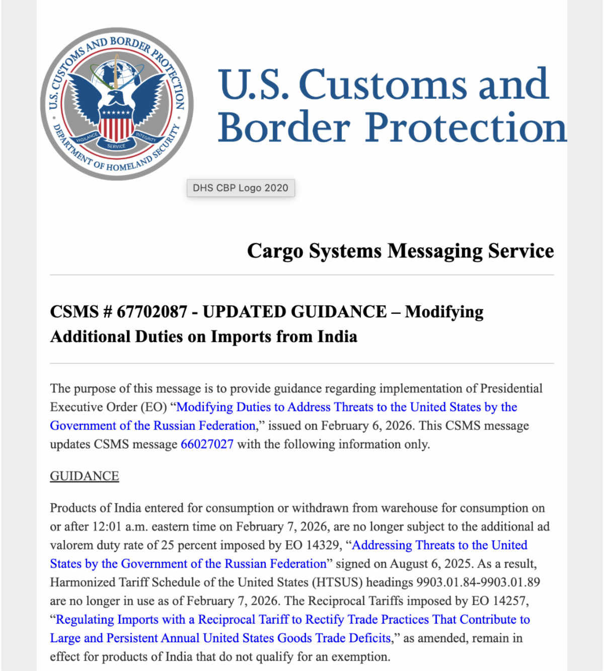 Please note US Customs has updated their system to reflect the removal of the 25% India/Russian oil tariff, and this is effective for shipments that arrived on or after Feb 7th, 2026. However, the reduction from 25% IEEPA Reciprocal Tariff to 18% has NOT yet been implemented. The White House has just made an announcement regarding this tariff reduction to 18%, so US Customs will most likely have an update in the next day or 2.