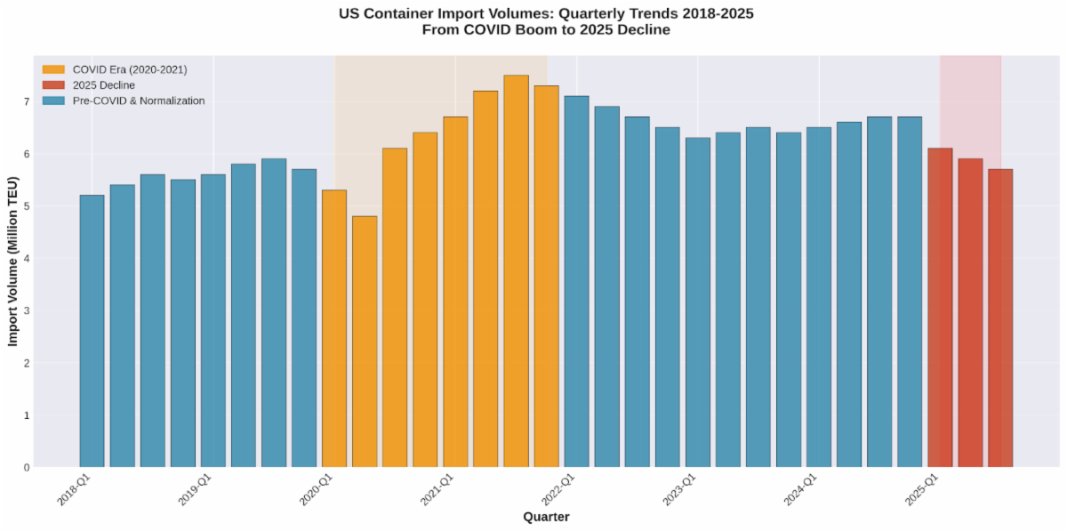 Data from Vizion points to a -19% year-on-year decline for US container volume imports in November and December. Looking at Q3 2025 versus Q3 2024, the report shows major volume decline with Toys down 35%, Furniture & Bedding down 33%, Apparel and Footwear down 10-17% and solar panels down 67%.